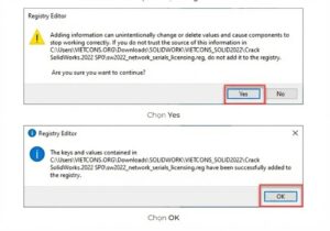 Bước 1: Giải nén file vừa tải về. Vào thư mục _SolidSQUAD_, chạy file sw2022_network_serials_licensing.reg. Nhấn Yes -> OK.